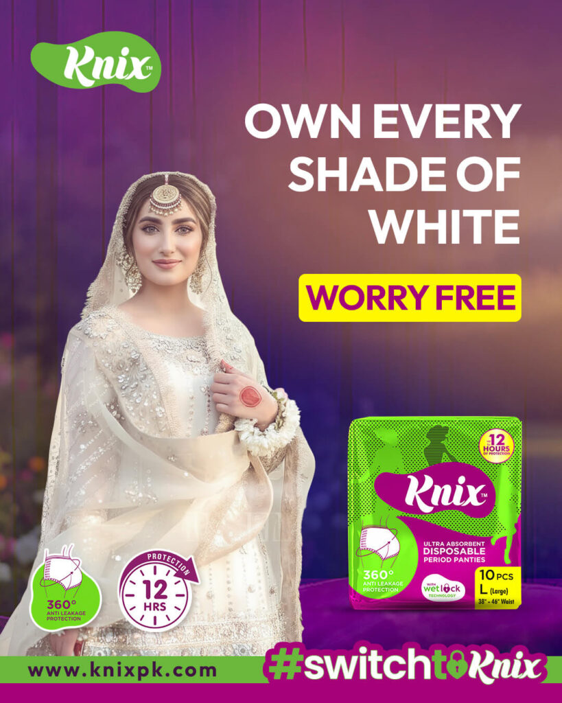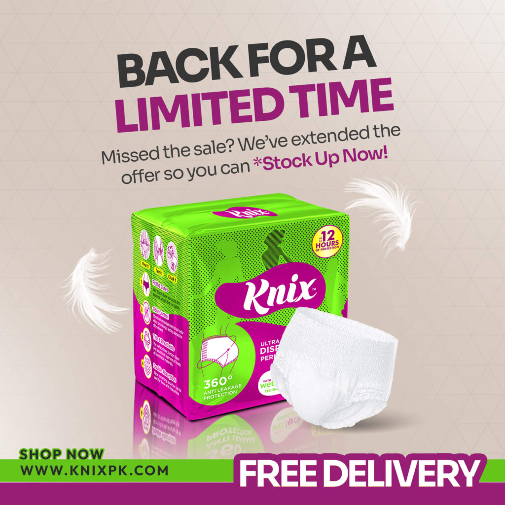 Knix Disposable Sanitary Panties – First Time Made in Pakistan. Made with high-quality absorbent materials, Knix protection and 360° Anti-Leakage Technology and and American Wet Lock Technology for a hassle-free period experience. Made with high-quality absorbent materials, Knix keeps you dry, fresh, and worry-free all day long.