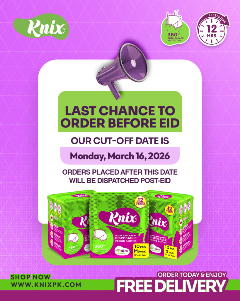Knix Disposable Sanitary Panties – First Time Made in Pakistan. Made with high-quality absorbent materials, Knix protection and 360° Anti-Leakage Technology and and American Wet Lock Technology for a hassle-free period experience. Made with high-quality absorbent materials, Knix keeps you dry, fresh, and worry-free all day long.